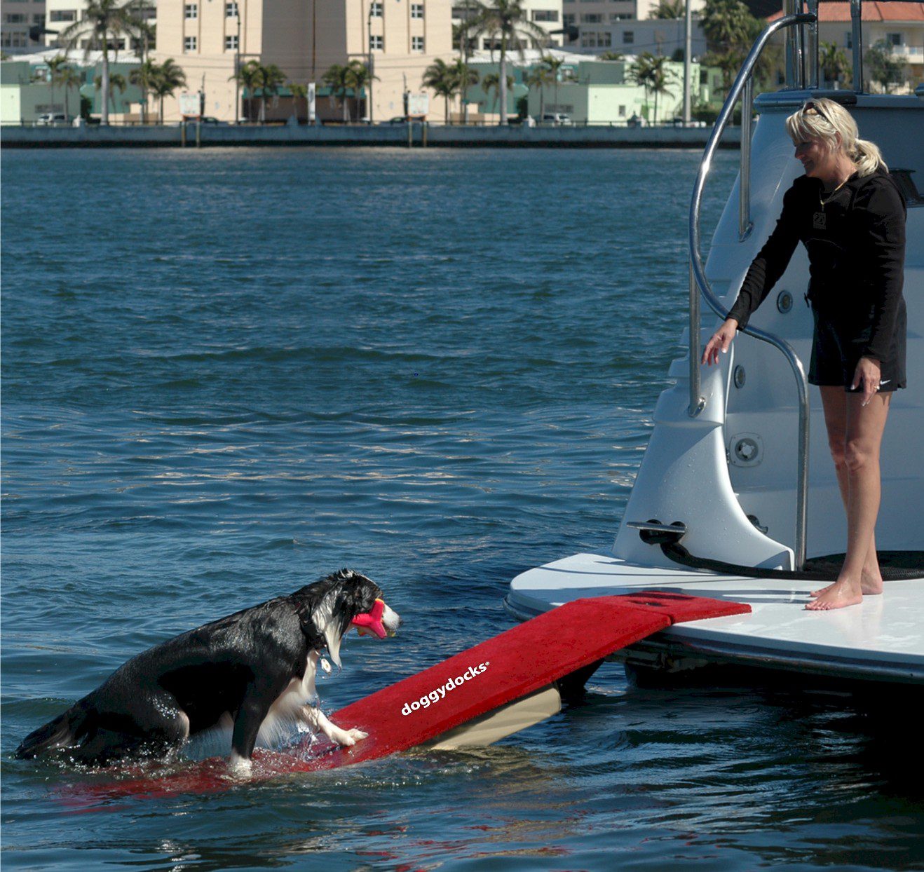 The Original doggydocks® Floating Water Ramp for dogs up to 60 lbs. Provide a safe and easy way for dogs to exit the water from docks, boats, and pools with out as assistance. The buoyant design creates a gradual incline that simulates a natural shoreline. It Provides a secure and stable surface so even small dogs love using..